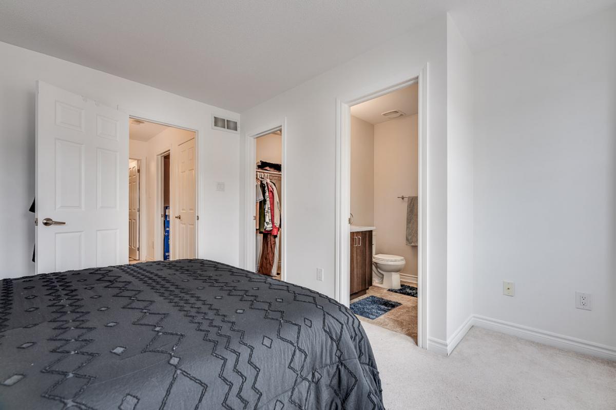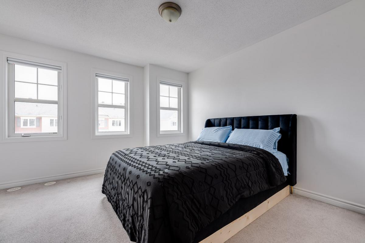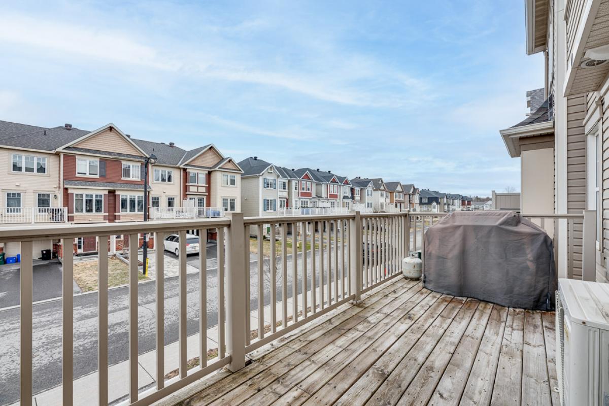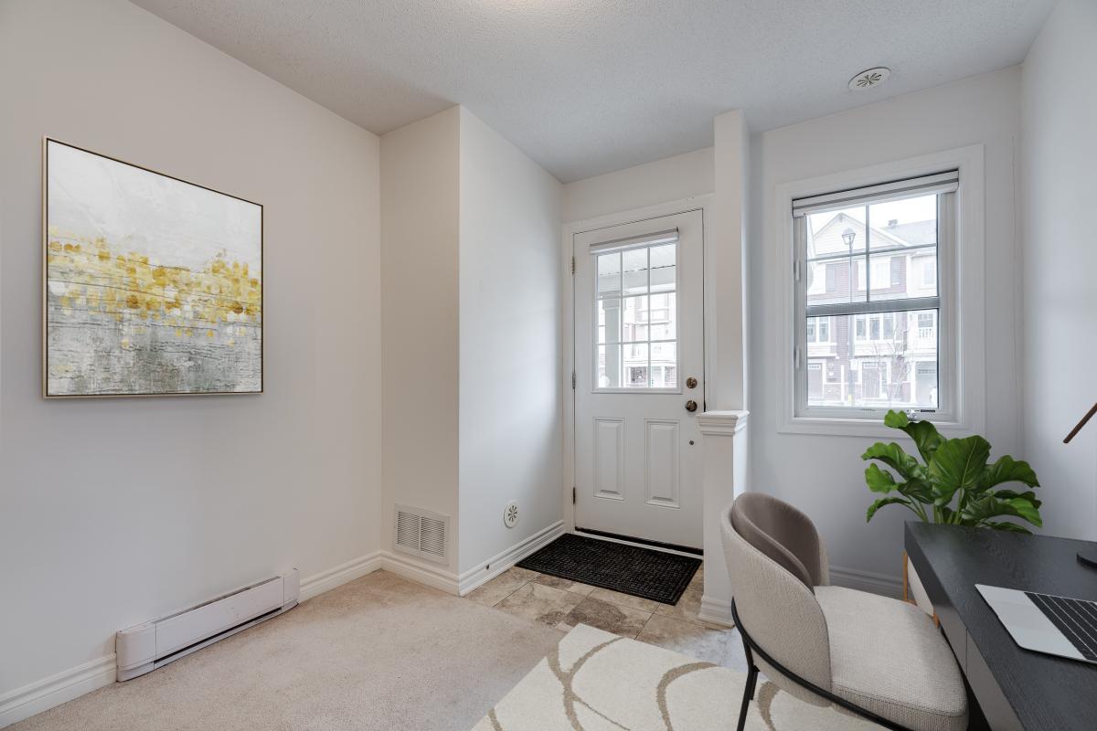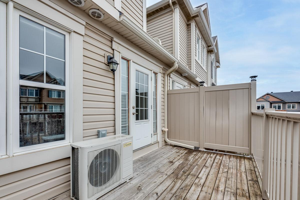 Step into this charming 3-level stacked row unit nestled in the neighborhood of Half Moon Bay. Featuring 2 bedrooms, 2.5 bathrooms, and a versatile den. Upon entry, you're greeted by a den, ideal for a home office or study area, while the ground level also features convenient access to the attached garage. Ascend to the main level, where an open-concept layout awaits, featuring a functional kitchen with stainless steel appliances and ample storage, seamlessly flowing into the inviting living/dining area flooded with natural light. Indulge in relaxation as you step onto your private balcony. Venture upstairs to discover a spacious primary suite with a walk-in closet and an ensuite bathroom, along with a generously sized second bedroom and a well-appointed full bathroom. Located in a great community, enjoy easy access to parks, trails, schools, dining, and entertainment options. Embrace the convenience of urban living while relishing the tranquility of suburban charm.